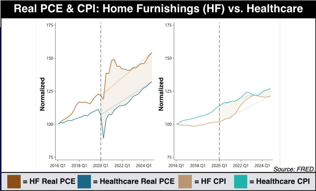 Real spending on home furnishings has dramatically outpaced necessities like food & healthcare, with consumers allocating increasingly more resources toward home improvements