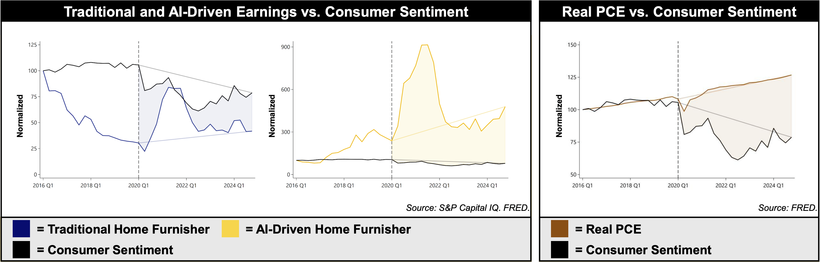 Traditional furnishers’ performance converges and correlates with post-2020 declining sentiment, while AI furnishers thrive. Regression analysis shows anti-cyclical features that insulate AI furnishers against periods of weak consumer confidence, where AI furnishers are 87% less sensitive to consumer sentiment than traditional counterparts.