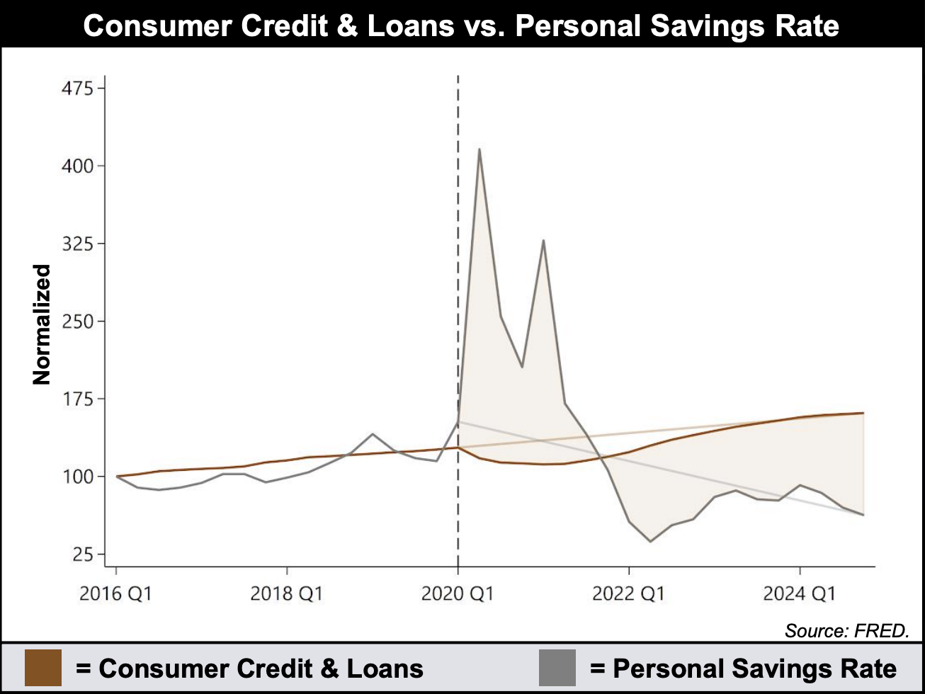 Post-2020, savings rates collapsed from pandemic highs while revolving consumer credit and loan utilization steadily climbed.