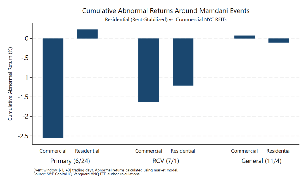 What we found was the opposite: around the primary election, commercial REITs underperformed residential REITs by 2.8 percentage points—a statistically significant differential (p = 0.01). Commercial REITs experienced average cumulative abnormal returns of -2.6%, while residential REITs posted +0.2%. The pattern held directionally at the RCV confirmation, with both groups posting declines but commercial REITs again exhibiting relative underperformance. By the general election, the differential had largely disappeared as markets fully priced in Mamdani’s expected victory.
